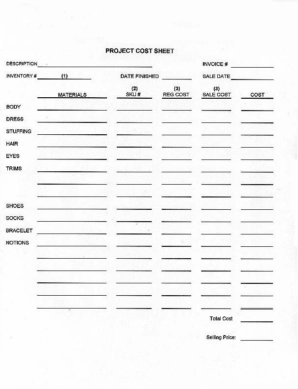 Here is the cost sheet that I talked about on the Dollmakers List; this sheet can be modified to meet your particular needs. As I said, there is definitely a lot of work involved in keeping track of this information; however, you must know your costs to determine if you are pricing your dolls appropriately. |